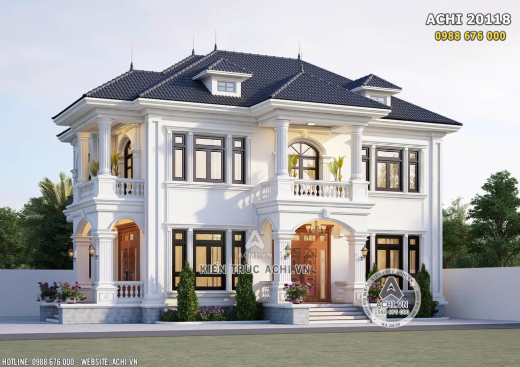 Mẫu nhà ACHI 20118 kết hợp phong cách Tân Cổ Điển sang trọng với mái Nhật thanh thoát, tạo nên vẻ đẹp hiện đại và vững chãi.